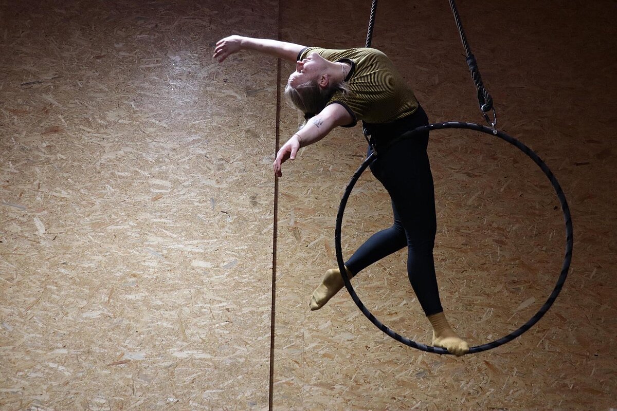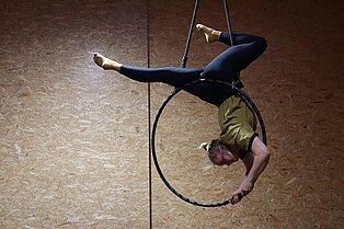 Wir lernen verschiedene Tricks und Abfolgen am Aerial Hoop, sodass für Jede*n was dabei ist!